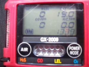 先日の、槽内洗浄でも活躍してくれている弊社のガス検知器で計ってみました。